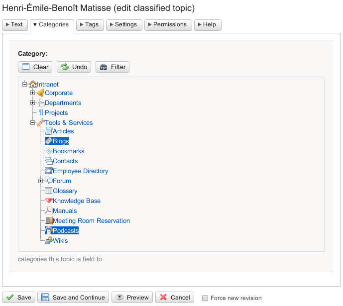 23 Jan 2017: added support for Foswiki:Extensions/LikePlugin; added "Responsible Person" to Category topics; replace css and js inline with proper files created by AttachContentPlugin; hide the sidebar on categories by default; improvements to ControlledTopics and ClassifiedControlledTopics; added quality checks to ClassifiedTopics: missing tags, missing categories, duplicate h1; improved view template for workflow history; removed old IconSet: now using icon formfield of MoreFormfieldsPlugin; improved visualization of workflows using GraphvizPlugin; fixed WebDAV view for categorized content; some fixes for cat and tag formfields; rewrite of core code to be more oo-ish ; new REST hander updateCache to refresh the classification cache occasionally; new notification handler that lets you subscribe to any changes within a category; auto-subscribe ResponsiblePerson to its category: may be switched on/off by AUTOSCUBSCRIBE_RESPONSIBLE_PERSON preference; fixed memory leaks; implemented special ACLs to control edit rights on categories