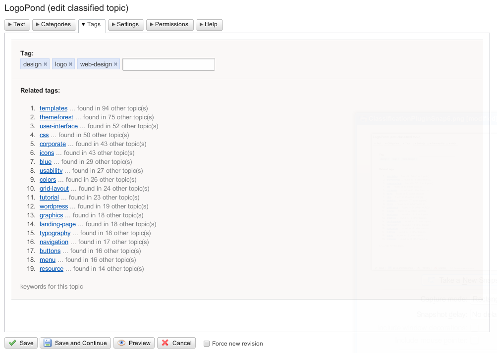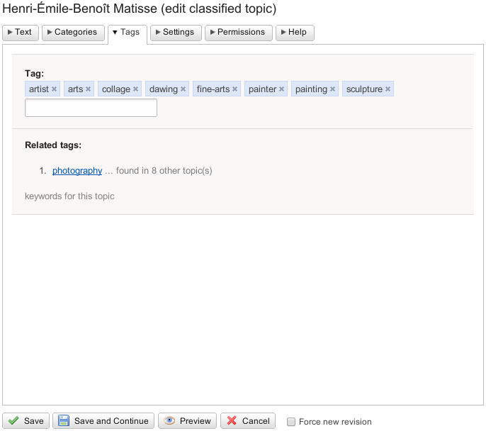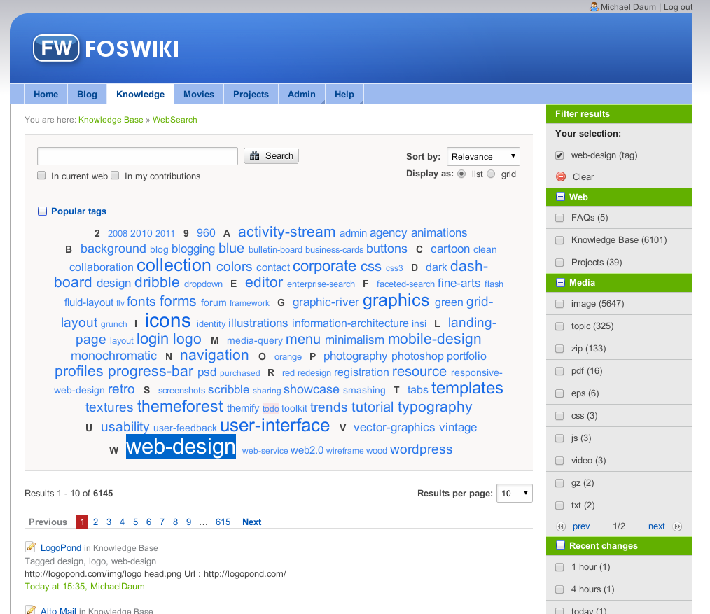 ClassificationPlugin is a taxonomy and folksonomy extension for Foswiki that allows you to manage knowledge assets stored in your wiki. Users can organize their content by filing topics into categories and by adding offhand tags. Classifying content using categories and tags are the key factors to foster sustainable knowledge management. This becomes even more important in a wiki environment where content is created quickly but has to be made available for a longer period of time.
