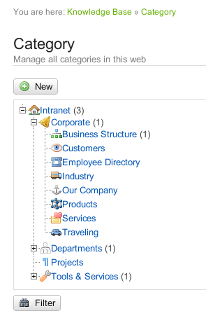 Tagging for corporate intranets: While categories establish a predefined vocabulary, tags are a way to assign keywords to wiki content in an ad hoc fashion. This completes category knowledge management in a natural and fruitful way.